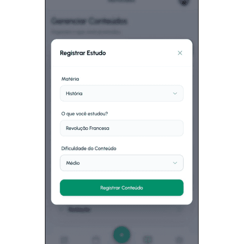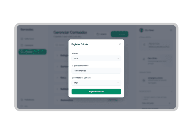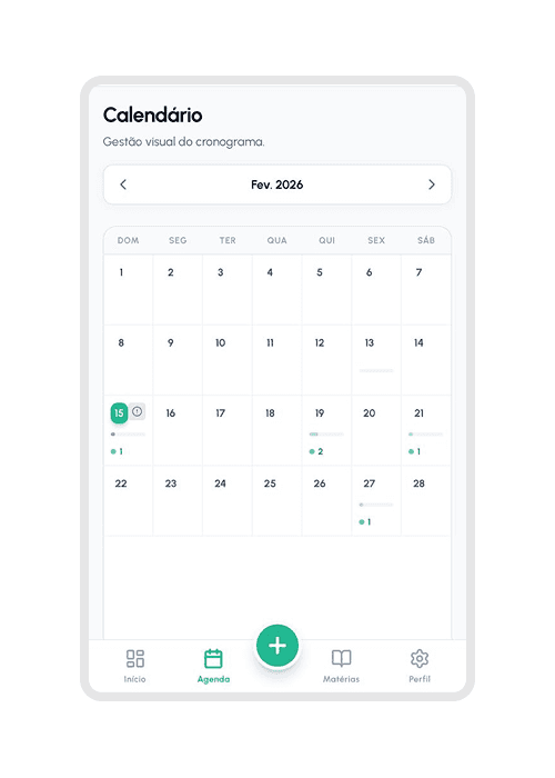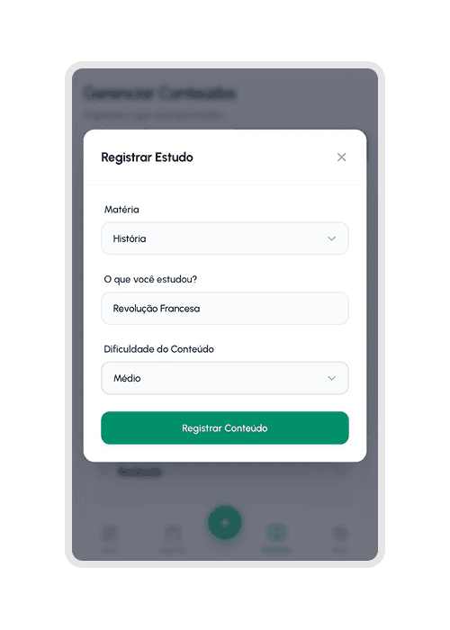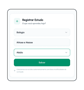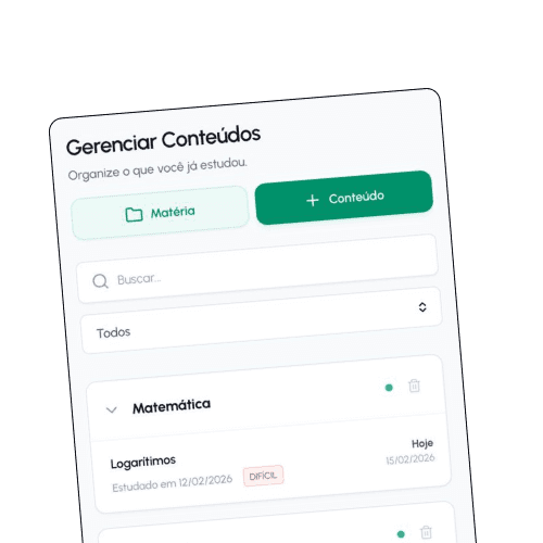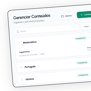 Cada matéria e conteúdo entram em um sistema que acompanha sua evolução e prepara revisões futuras automaticamente.