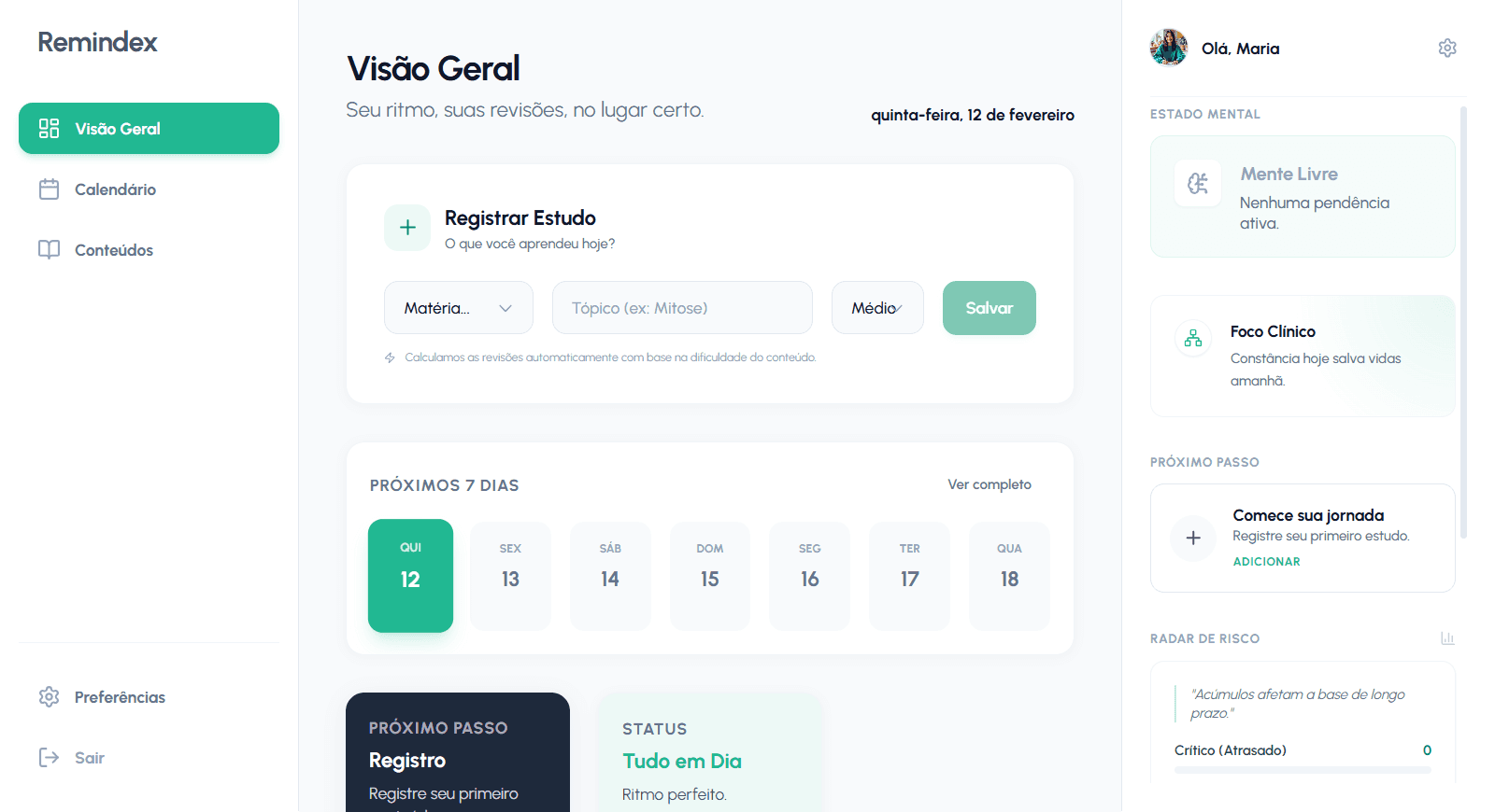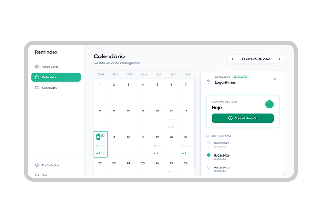 “Percebi que o problema não era falta de estudo, era revisar na hora errada. O calendário do Remindex mudou completamente minha retenção.”