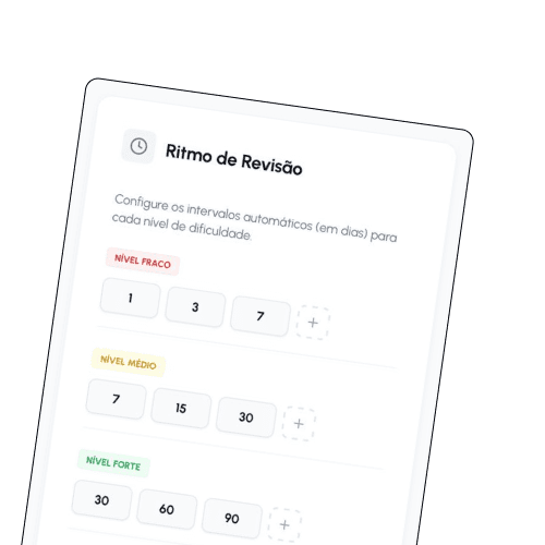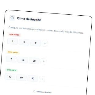 Defina preferências iniciais e deixe o sistema ajustar o ciclo de revisões conforme seu progresso.